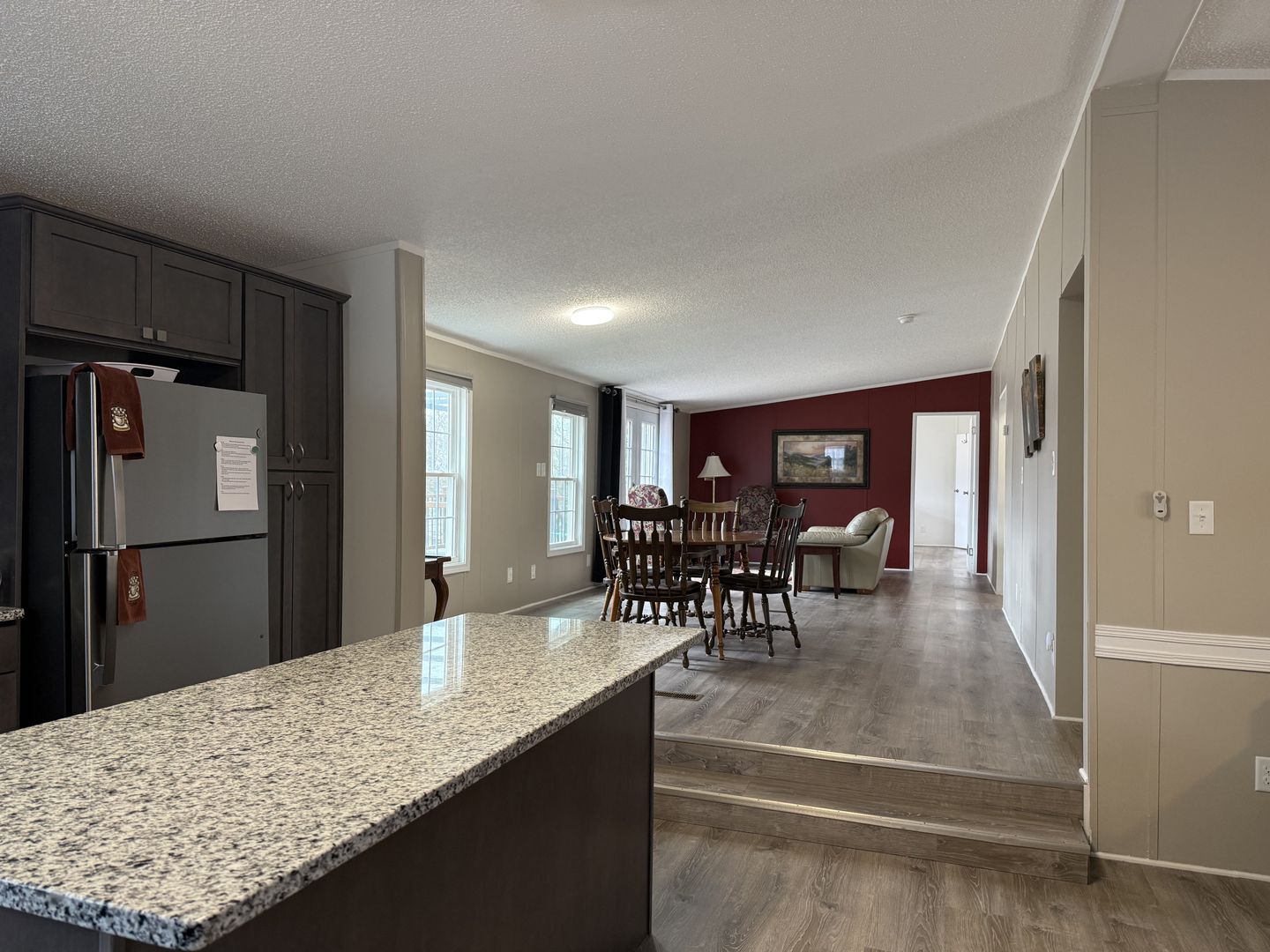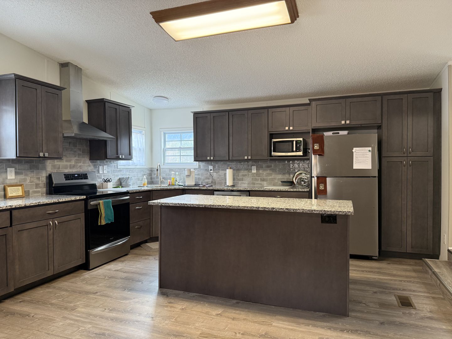 This home features an open floor plan with spacious living and dining areas, plus a cozy den with a decorative fireplace. The kitchen offers granite countertops, stainless steel appliances, and a large island that doubles as a breakfast bar—perfect for cooking or gathering with friends and family.